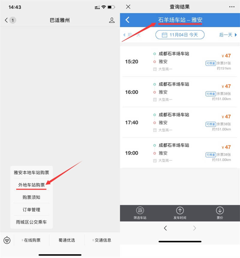11月4日,蜀通公司線上購票平臺“巴適雅州”微信公眾號開通省內外多地區(qū)汽車購票業(yè)務。