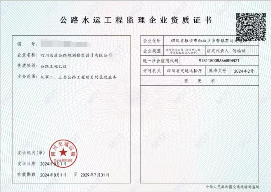 近日,經四川省交通運輸廳批準,雅安交建集團勘察設計公司成功取得公路工程監(jiān)理乙級資質,該資質的成功獲批,標志著我公司業(yè)務邁向新領域。