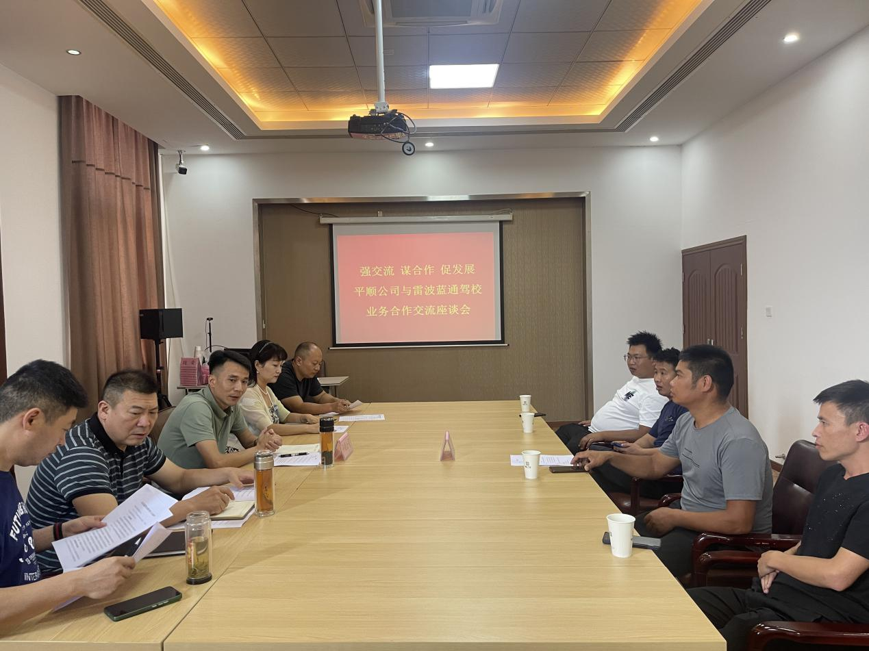 7月31日,雷波縣藍通機動車駕駛培訓有限責任公司總經理陳能勇一行4人赴平順公司開展實地調研,并與平順公司進行業(yè)務合作座談。考察組對公司科二、科三考場進行實地考察,對考試車輛進行實車體驗,對服務品質進行現場了解,對業(yè)務合作事宜進行深入交流溝通,并達成合作共識。