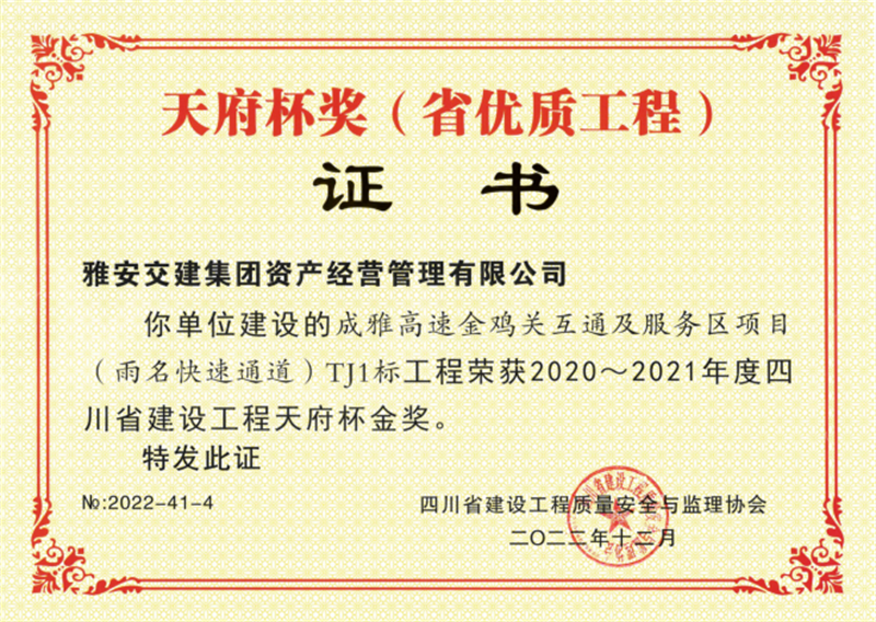 近日,雅安交建集團資產(chǎn)經(jīng)營管理有限公司建設(shè)的成雅高速金雞關(guān)互通及服務(wù)區(qū)項目(雨名快速通道)TJ1標(biāo)工程榮獲2020-2021年度四川省建設(shè)工程天府杯金獎。