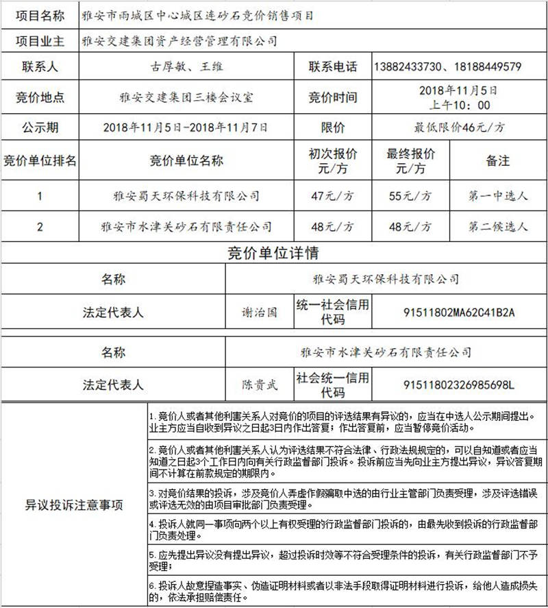 雅安交建集團資產經營管理有限公司關于雅安市雨城區(qū)中心城區(qū)連砂石競價銷售結果公示
