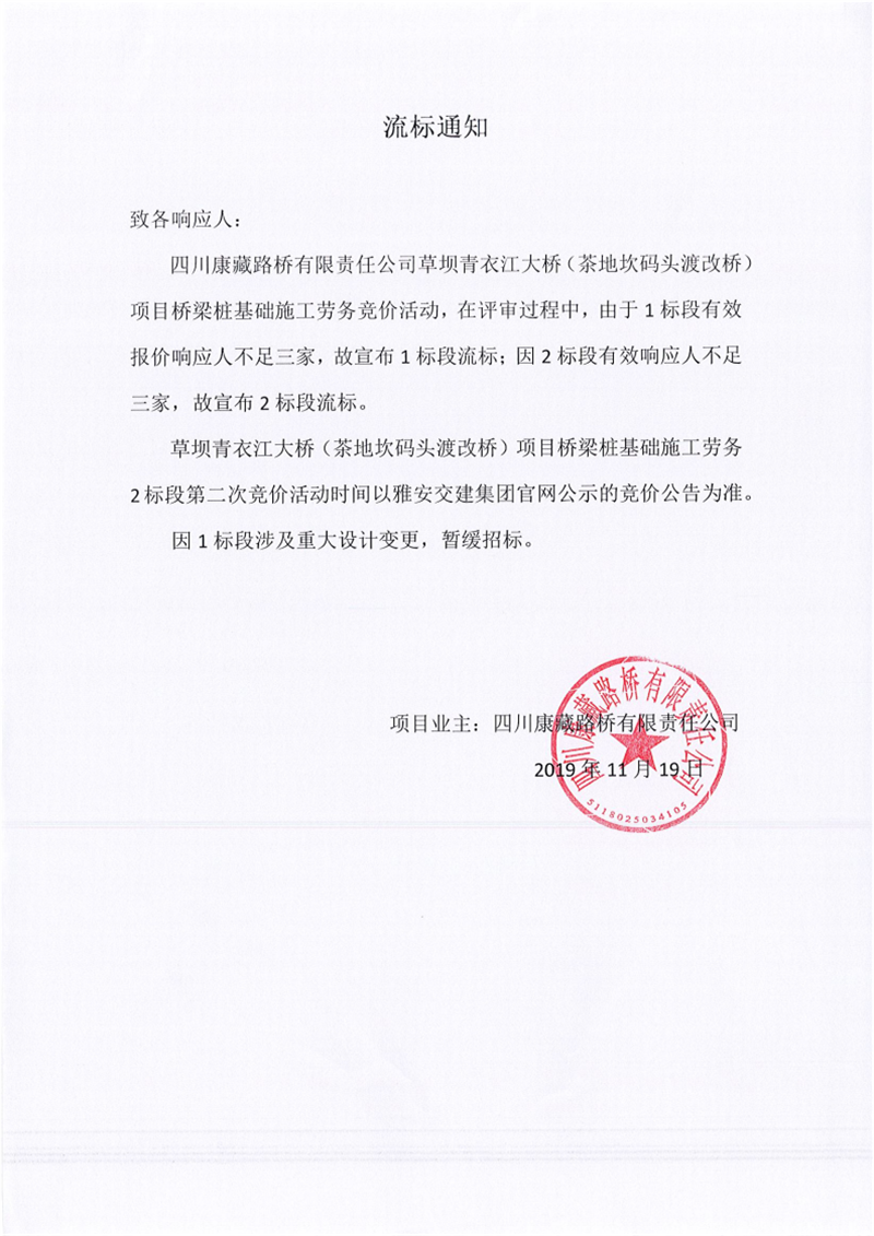 四川康藏路橋有限責(zé)任公司草壩青衣江大橋(茶地坎碼頭渡改橋)項(xiàng)目橋梁樁基礎(chǔ)施工勞務(wù)競價(1標(biāo)段、2標(biāo)段)流標(biāo)通知