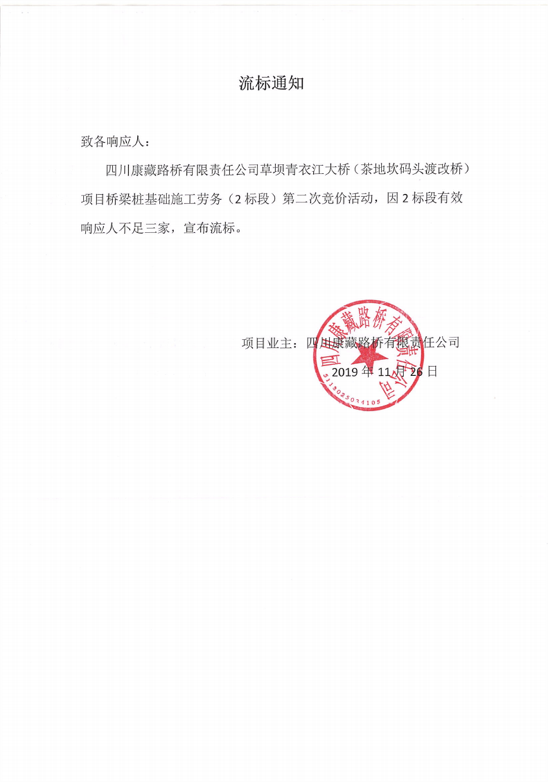 四川康藏路橋有限責任公司草壩青衣江大橋(茶地坎碼頭渡改橋)項目橋梁樁基礎(chǔ)(2標段)施工勞務(wù)競價(第二次)流標通知