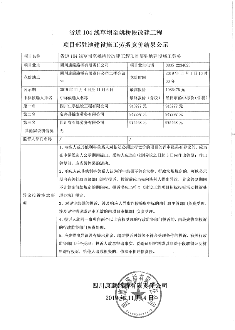 四川康藏路橋有限責(zé)任公司省道104線草壩至姚橋段改建工程項(xiàng)目部駐地建設(shè)施工勞務(wù)競價(jià)結(jié)果公示
