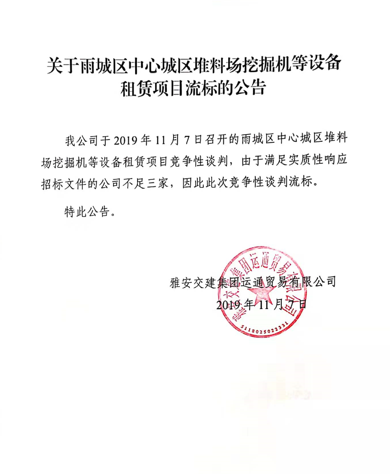 雅安交建集團(tuán)運(yùn)通貿(mào)易有限公司關(guān)于雨城區(qū)中心城區(qū)堆料場(chǎng)挖掘機(jī)等設(shè)備租賃項(xiàng)目流標(biāo)的公告