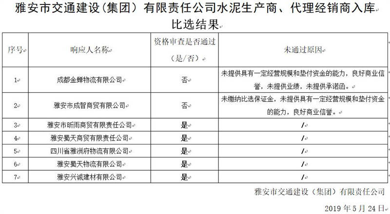 雅安市交通建設(shè)(集團)有限責任公司水泥生產(chǎn)商、代理經(jīng)銷商入庫比選結(jié)果公示