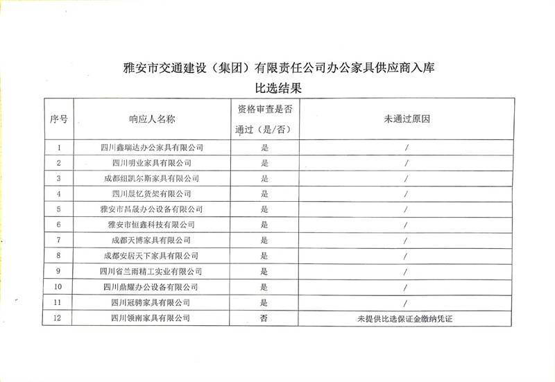 雅安市交通建設(shè)(集團)有限責任公司辦公家具供應(yīng)商入庫比選結(jié)果