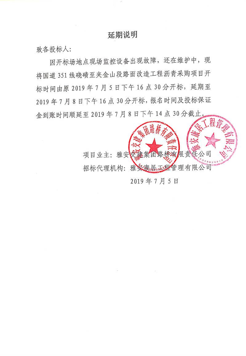 雅安交建集團路橋有限責(zé)任公司國道351線磽磧至夾金山段路面改造工程瀝青采購招標(biāo)延期說明