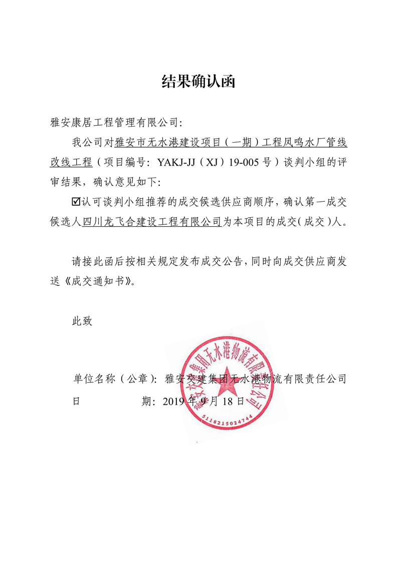 雅安交建集團(tuán)無水港物流有限責(zé)任公司雅安市無水港建設(shè)項(xiàng)目(一期)工程鳳鳴水廠管線改線工程競(jìng)爭(zhēng)性談判結(jié)果公示