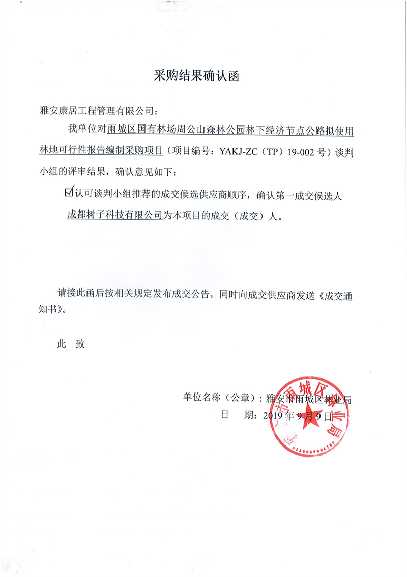雅安市雨城區(qū)林業(yè)局雨城區(qū)國有林場周公山森林公園林下經(jīng)濟(jì)節(jié)點公路擬使用林地可行性報告編制采購項目競爭性談判結(jié)果公示