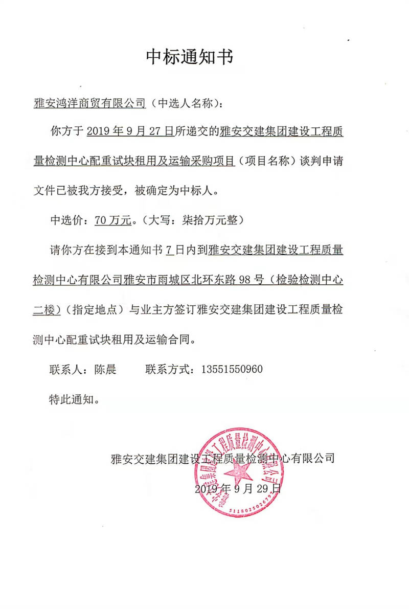 雅安交建集團建設工程質量檢測中心配重試塊租用及運輸采購項目中標公示