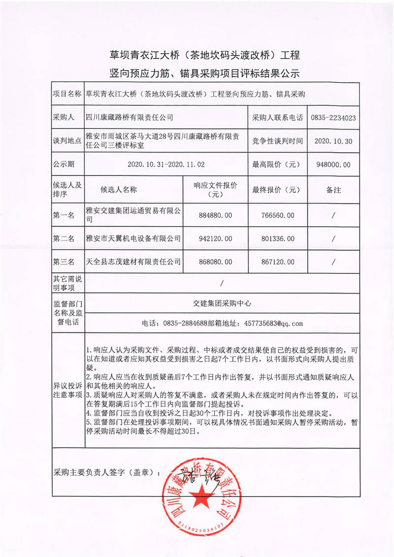 四川康藏路橋有限責(zé)任公司草壩青衣江大橋(茶地坎碼頭渡改橋)工程豎向預(yù)應(yīng)力筋、錨具采購(gòu)項(xiàng)目評(píng)標(biāo)結(jié)果公示