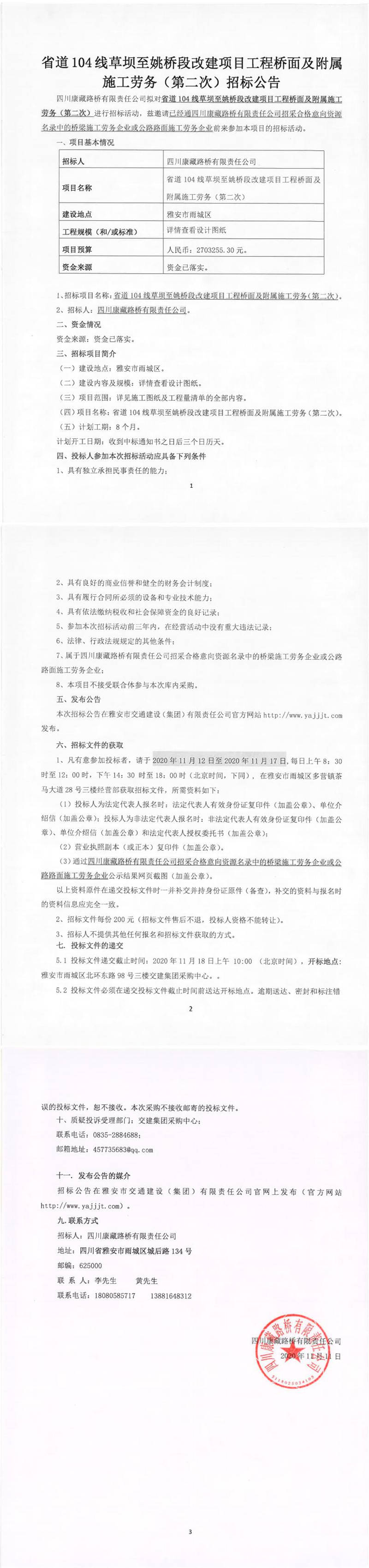 四川康藏路橋有限責任公司省道104線草壩至姚橋段改建項目工程橋面及附屬施工勞務(wù)(第二次)招標公告