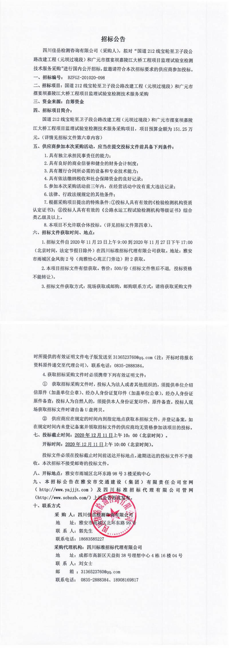 四川佳岳檢測(cè)咨詢有限公司國(guó)道212線寶輪至衛(wèi)子段公路改建工程(元壩過境段)和廣元市擺宴壩嘉陵江大橋工程項(xiàng)目監(jiān)理試驗(yàn)室檢測(cè)技術(shù)服務(wù)采購(gòu)招標(biāo)公告