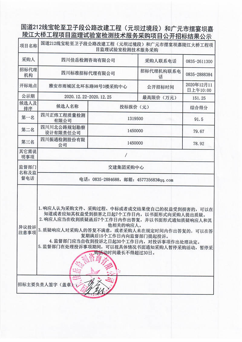 四川佳岳檢測咨詢有限公司國道212線寶輪至衛(wèi)子段公路改建工程(元壩過境段)和廣元市擺宴壩嘉陵江大橋工程項目監(jiān)理試驗室檢測技術(shù)服務采購項目公開招標結(jié)果公示