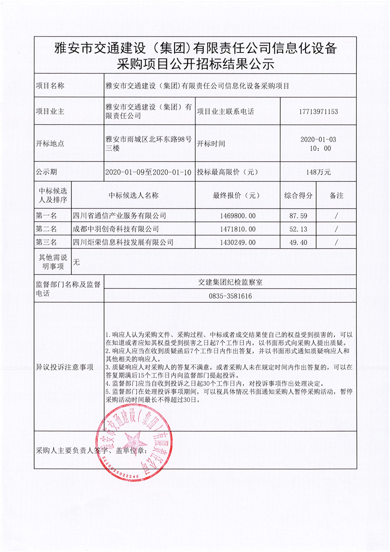 雅安市交通建設(shè)(集團)有限責任公司信息化設(shè)備采購項目公開招標結(jié)果公示
