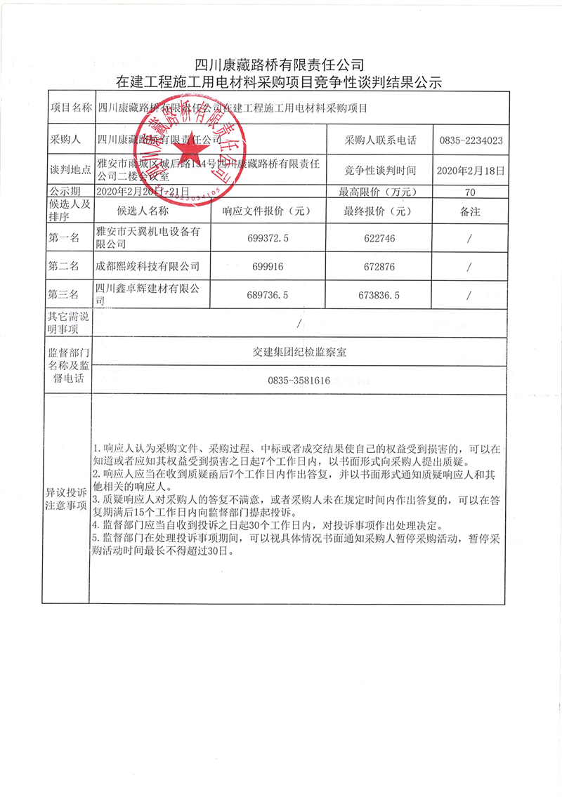 四川康藏路橋有限責(zé)任公司在建工程施工用電材料采購(gòu)項(xiàng)目競(jìng)爭(zhēng)性談判結(jié)果公示