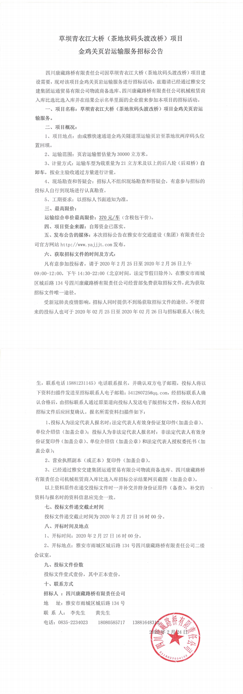四川康藏路橋有限責任公司草壩青衣江大橋(茶地坎碼頭渡改橋)項目金雞關頁巖運輸服務招標公告