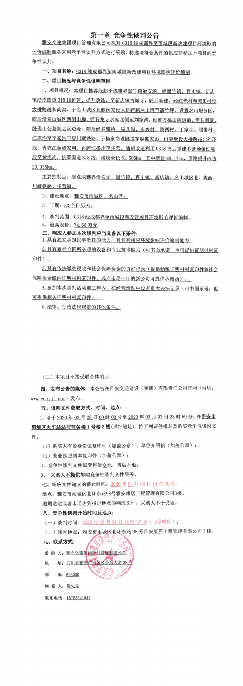 雅安交建集團項目管理有限公司G318線成都界至雨城段新改建項目環(huán)境影響評價編制競爭性談判公告