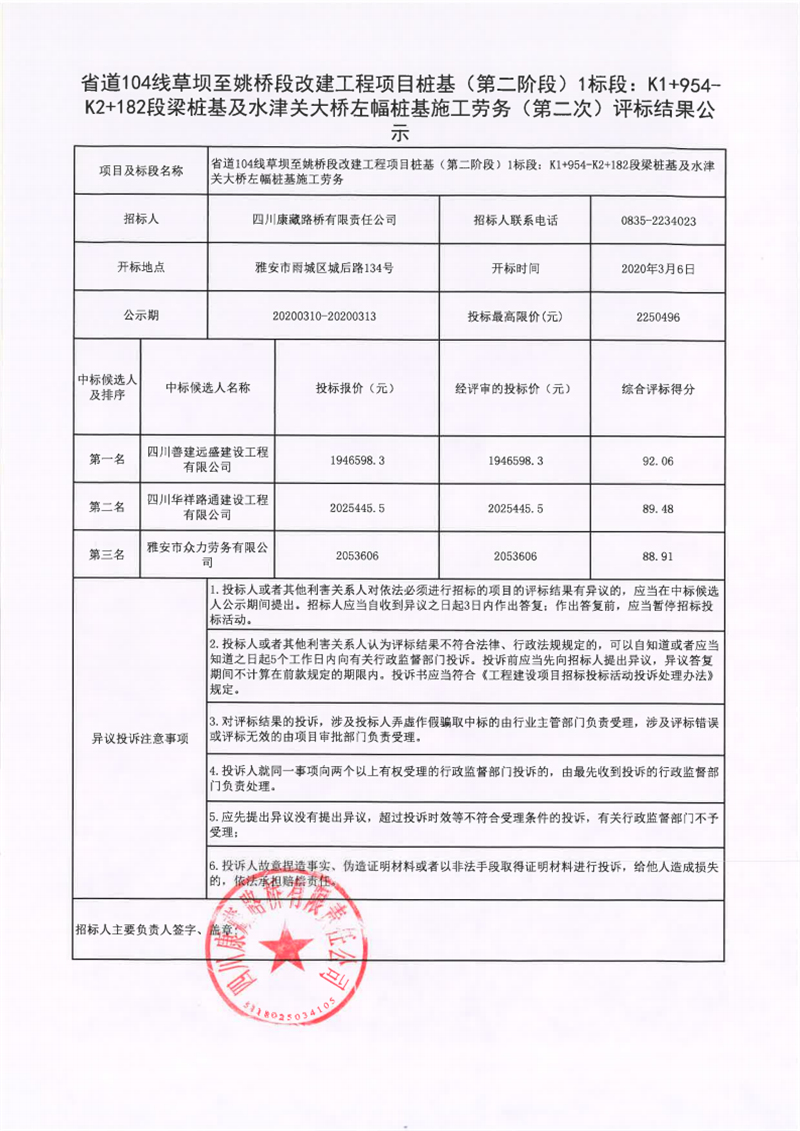 四川康藏路橋有限責(zé)任公司省道104線(xiàn)草壩至姚橋段改建工程項(xiàng)目樁基(第二階段)1標(biāo)段:K1+954-K2+182段梁樁基及水津關(guān)大橋左幅樁基施工勞務(wù)(第二次)評(píng)標(biāo)結(jié)果公示