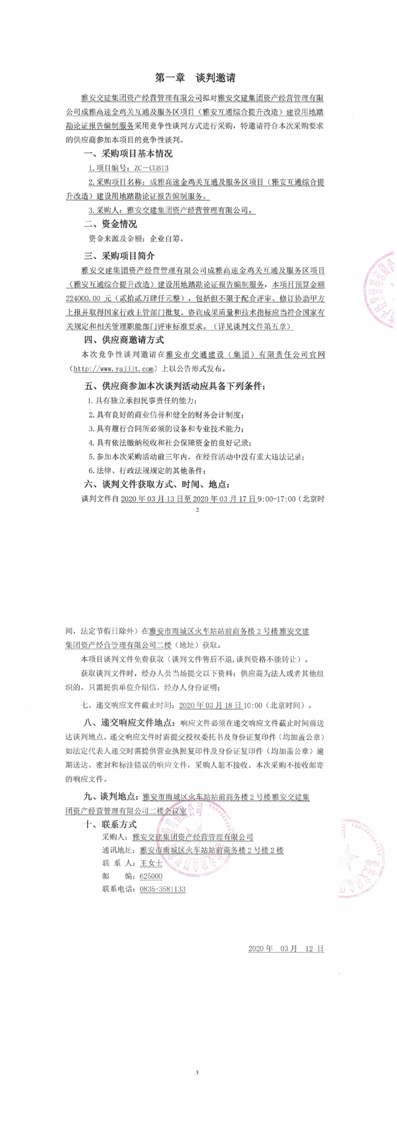 雅安交建集團(tuán)資產(chǎn)經(jīng)營管理有限公司成雅高速金雞關(guān)互通及服務(wù)區(qū)項(xiàng)目(雅安互通綜合提升改造)建設(shè)用地踏勘論證報(bào)告編制服務(wù)競爭性談判公告