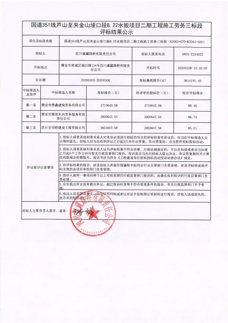 四川康藏路橋有限責任公司國道351線蘆山至夾金山埡口段8.22水毀項目二期工程施工勞務三標段評標結果公示