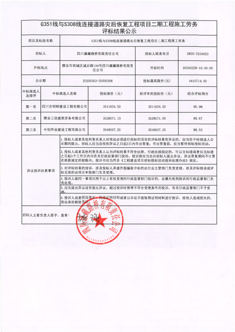 四川康藏路橋有限責(zé)任公司國(guó)道351線蘆山至夾金山埡口段8.22水毀項(xiàng)目二期工程施工勞務(wù)五標(biāo)段評(píng)標(biāo)結(jié)果公示
