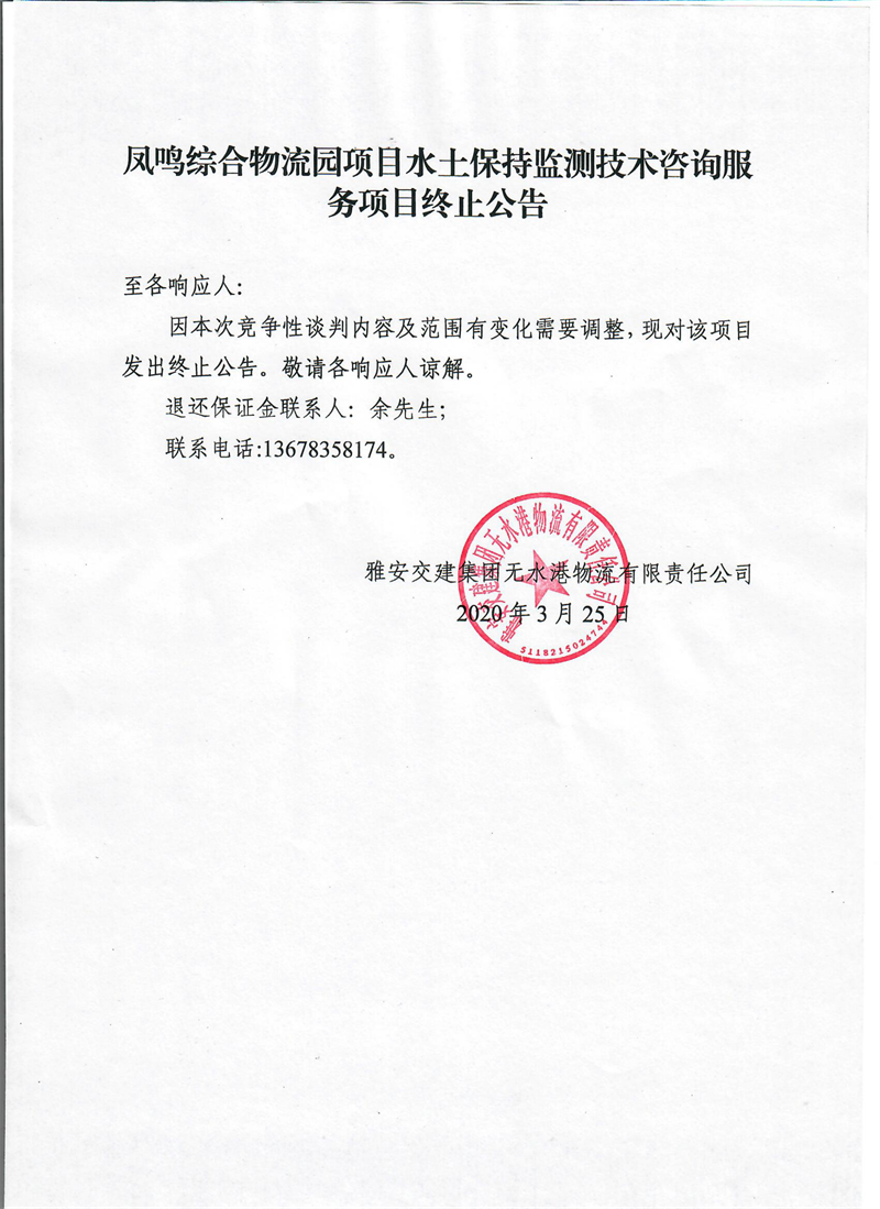 雅安交建集團無水港物流有限責(zé)任公司鳳鳴綜合物流園項目水土保持監(jiān)測技術(shù)咨詢服務(wù)項目終止公告