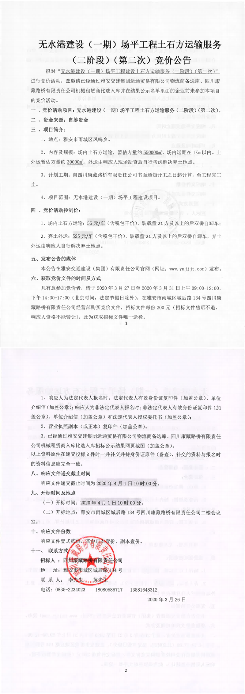 四川康藏路橋有限責任公司無水港建設(shè)(一期)場平工程建設(shè)土石方運輸服務(二階段)(第二次)競價公告