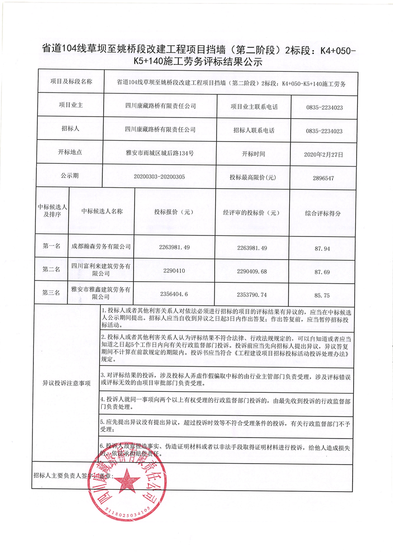 四川康藏路橋有限責(zé)任公司省道104線草壩至姚橋段改建工程項(xiàng)目擋墻(第二階段)2標(biāo)段:K4+050-K5+140施工勞務(wù)評標(biāo)結(jié)果公示