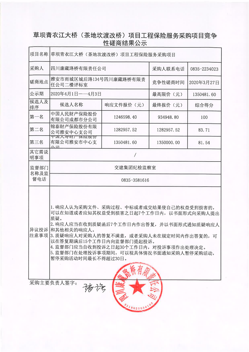 四川康藏路橋有限責(zé)任公司草壩青衣江大橋(茶地坎渡改橋)項(xiàng)目工程保險(xiǎn)服務(wù)采購項(xiàng)目競爭性磋商結(jié)果公示