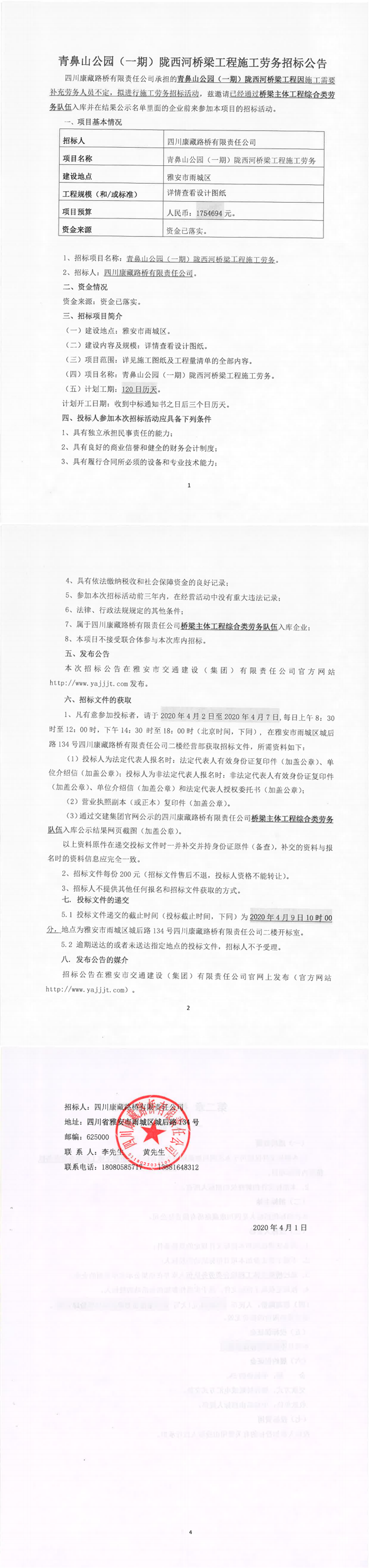 四川康藏路橋有限責(zé)任公司青鼻山公園(一期)隴西河橋梁工程施工勞務(wù)招標(biāo)公告