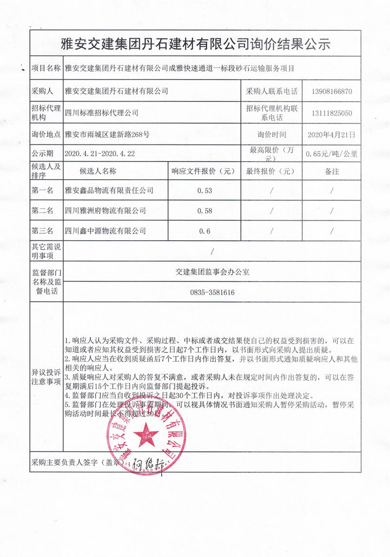 雅安交建集團(tuán)丹石建材有限公司成雅快速通道一標(biāo)段砂石運(yùn)輸服務(wù)項目詢價結(jié)果公示
