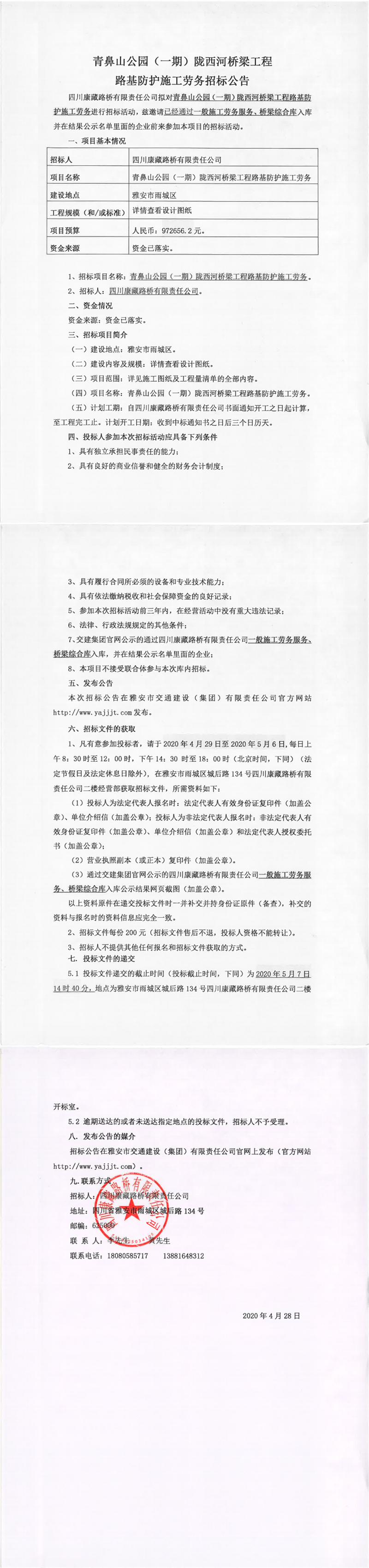 四川康藏路橋有限責(zé)任公司青鼻山公園(一期)隴西河橋梁工程路基防護(hù)施工勞務(wù)招標(biāo)公告