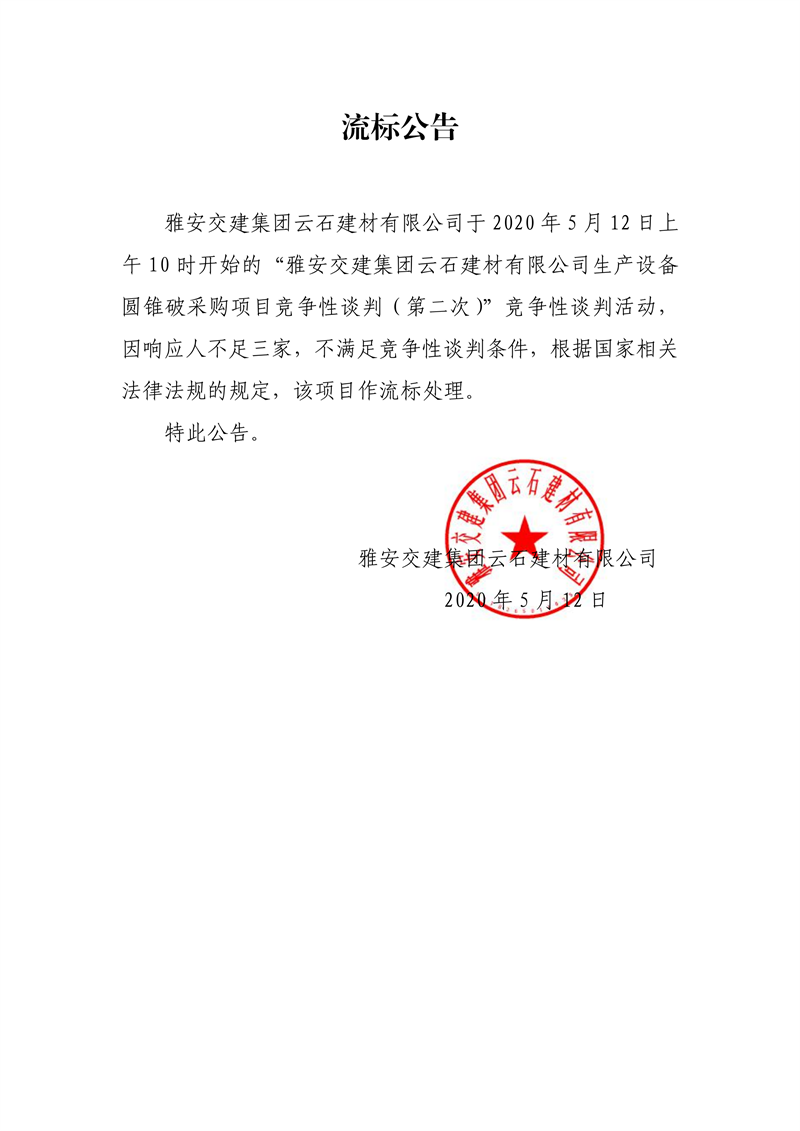 雅安交建集團(tuán)云石建材有限公司生產(chǎn)設(shè)備圓錐破采購項(xiàng)目(第二次)流標(biāo)公告