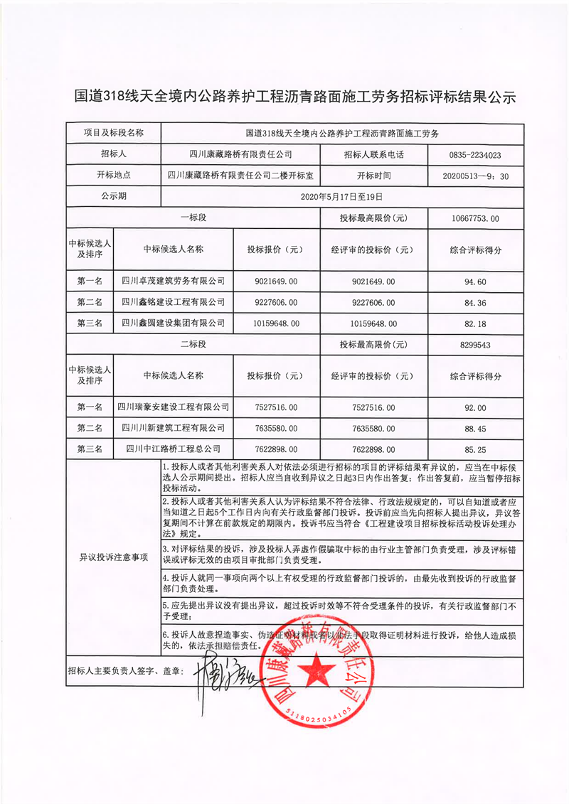 四川康藏路橋有限責任公司國道318線天全境內(nèi)公路養(yǎng)護工程瀝青路面施工勞務招標評標結(jié)果公示