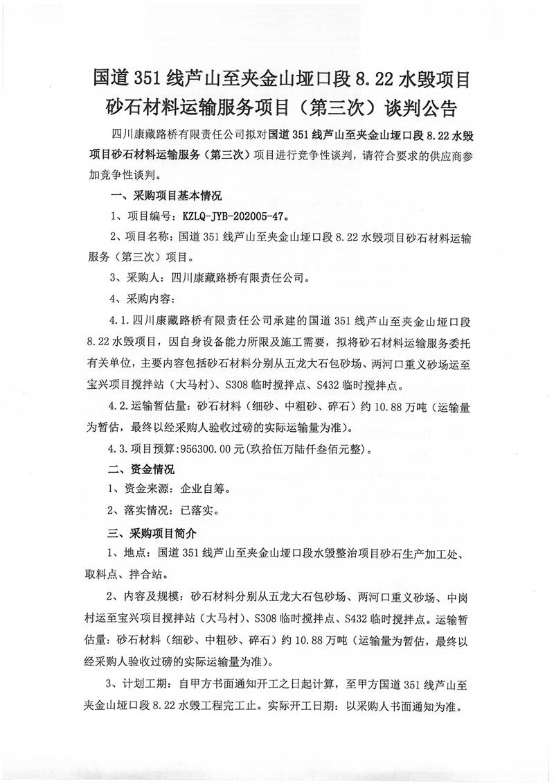 四川康藏路橋有限責(zé)任公司國道351線蘆山至夾金山埡口段8.22水毀項(xiàng)目砂石材料運(yùn)輸服務(wù)項(xiàng)目(第三次)談判公告