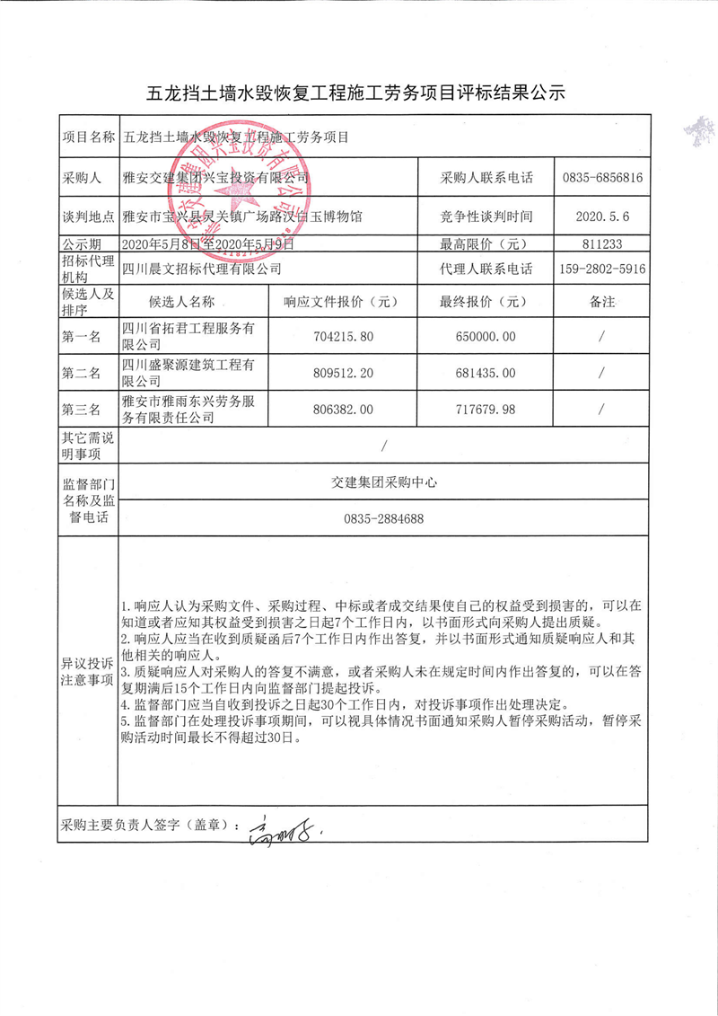 雅安交建集團(tuán)興寶投資有限公司五龍擋土墻水毀恢復(fù)工程施工勞務(wù)項(xiàng)目評標(biāo)結(jié)果公示