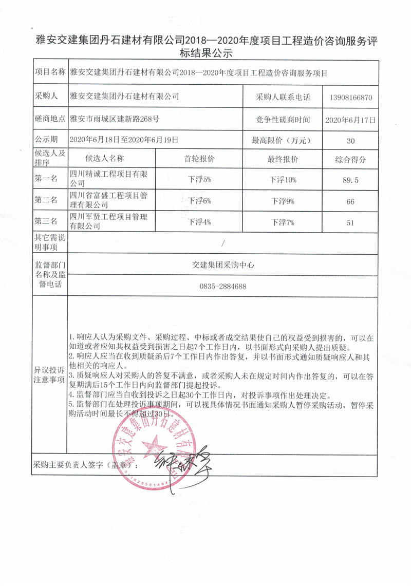 雅安交建集團(tuán)丹石建材有限公司2018—2020年度項(xiàng)目工程造價(jià)咨詢服務(wù)評(píng)標(biāo)結(jié)果公示