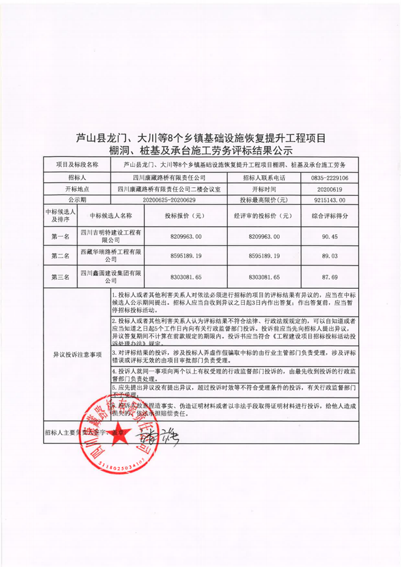 四川康藏路橋有限責任公司蘆山縣龍門、大川等8個鄉(xiāng)鎮(zhèn)基礎(chǔ)設(shè)施恢復(fù)提升工程項目棚洞、樁基及承臺施工勞務(wù)評標結(jié)果公示