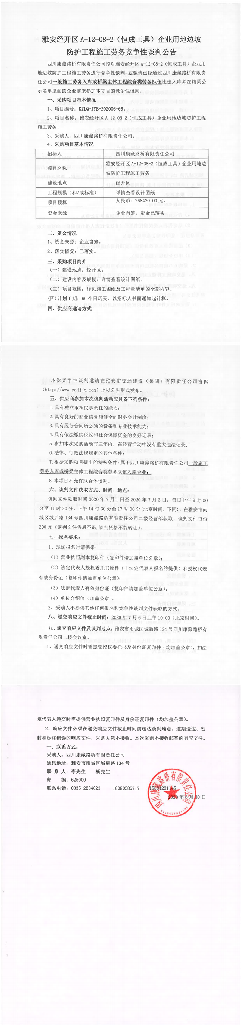 四川康藏路橋有限責(zé)任公司雅安經(jīng)開區(qū)A-12-08-2(恒成工具)企業(yè)用地邊坡防護工程施工勞務(wù)競爭性談判公告