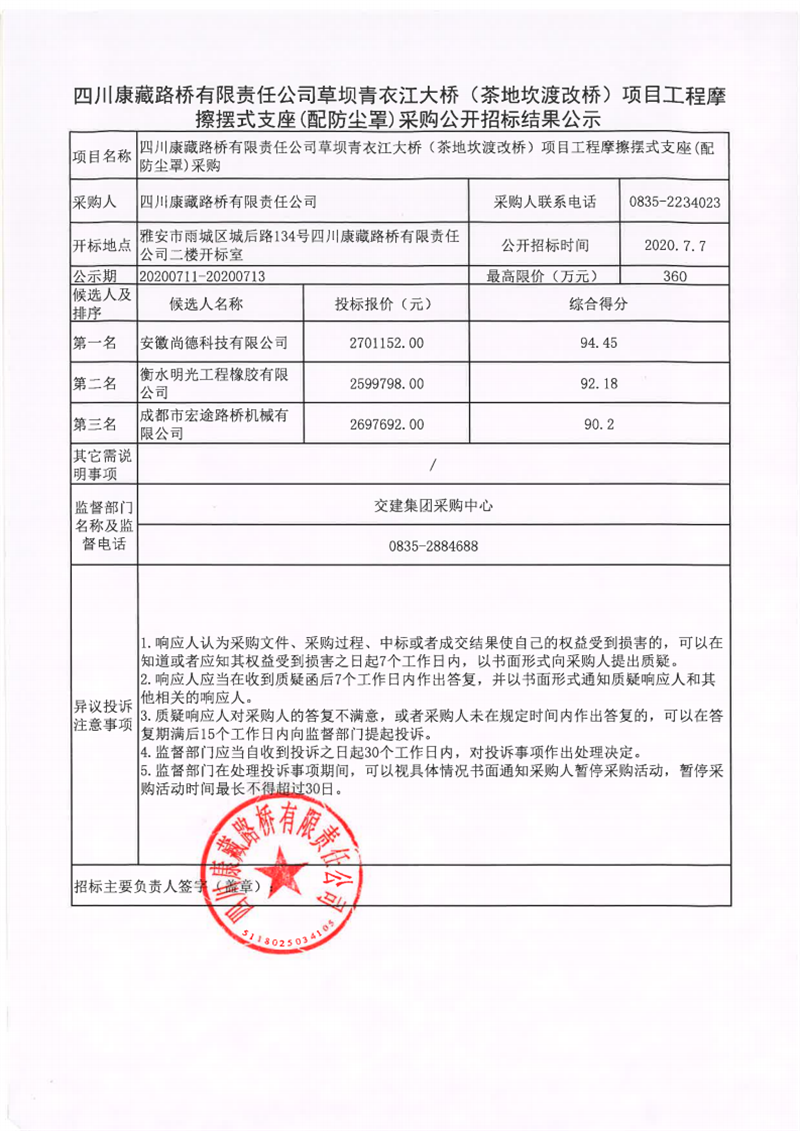 四川康藏路橋有限責(zé)任公司草壩青衣江大橋(茶地坎渡改橋)項(xiàng)目工程摩擦擺式支座(配防塵罩)采購公開招標(biāo)結(jié)果公示