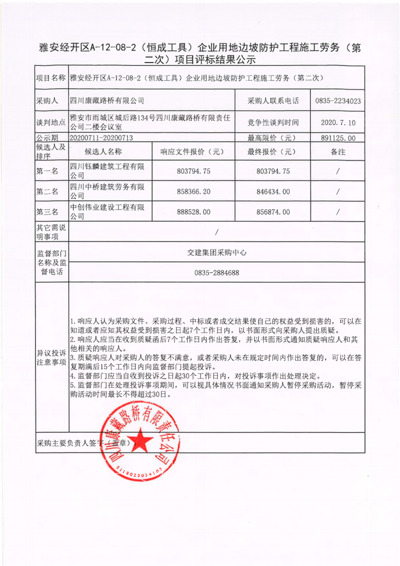 四川康藏路橋有限公司雅安經(jīng)開區(qū)A-12-08-2(恒成工具)企業(yè)用地邊坡防護工程施工勞務(第二次)項目評標結果公示