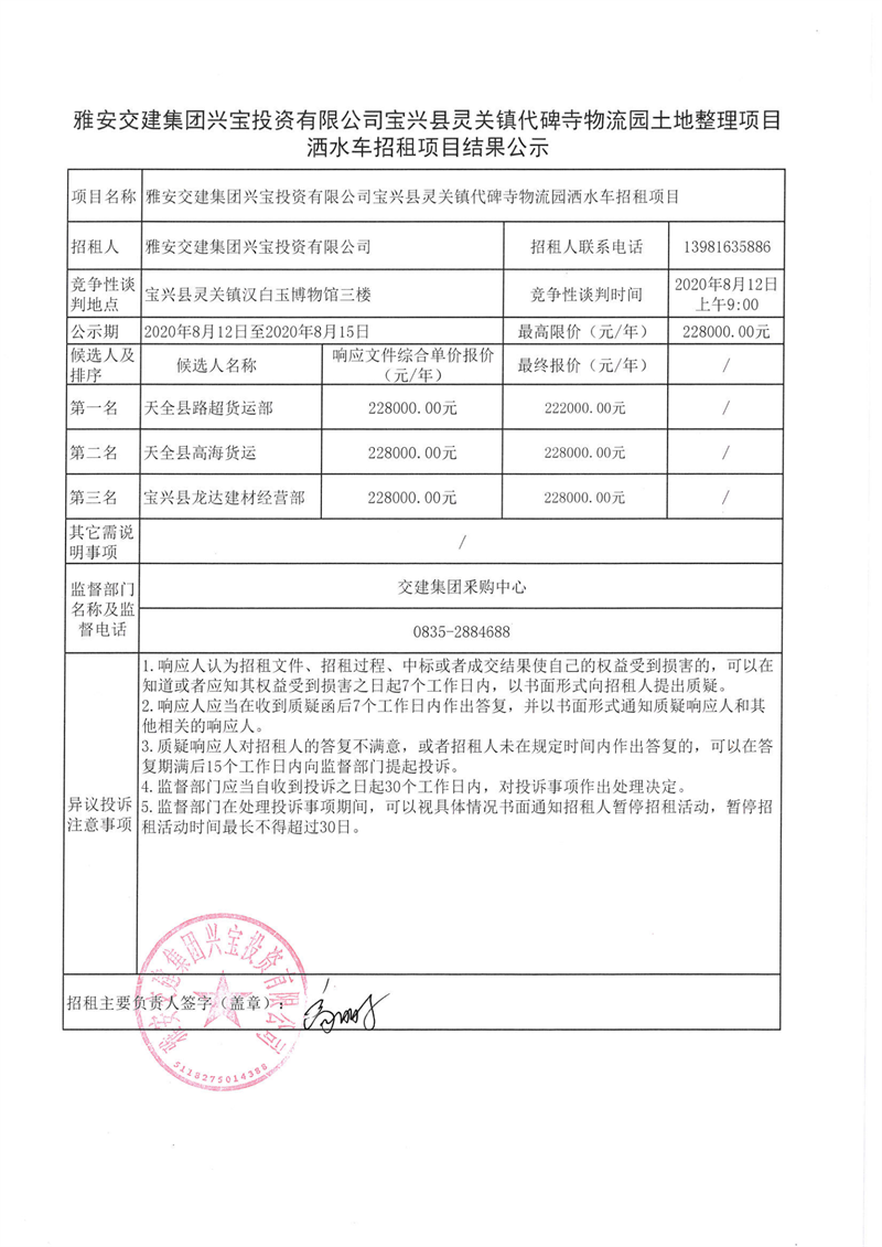 雅安交建集團(tuán)興寶投資有限公司寶興縣靈關(guān)鎮(zhèn)代碑寺物流園灑水車(chē)招租項(xiàng)目結(jié)果公示