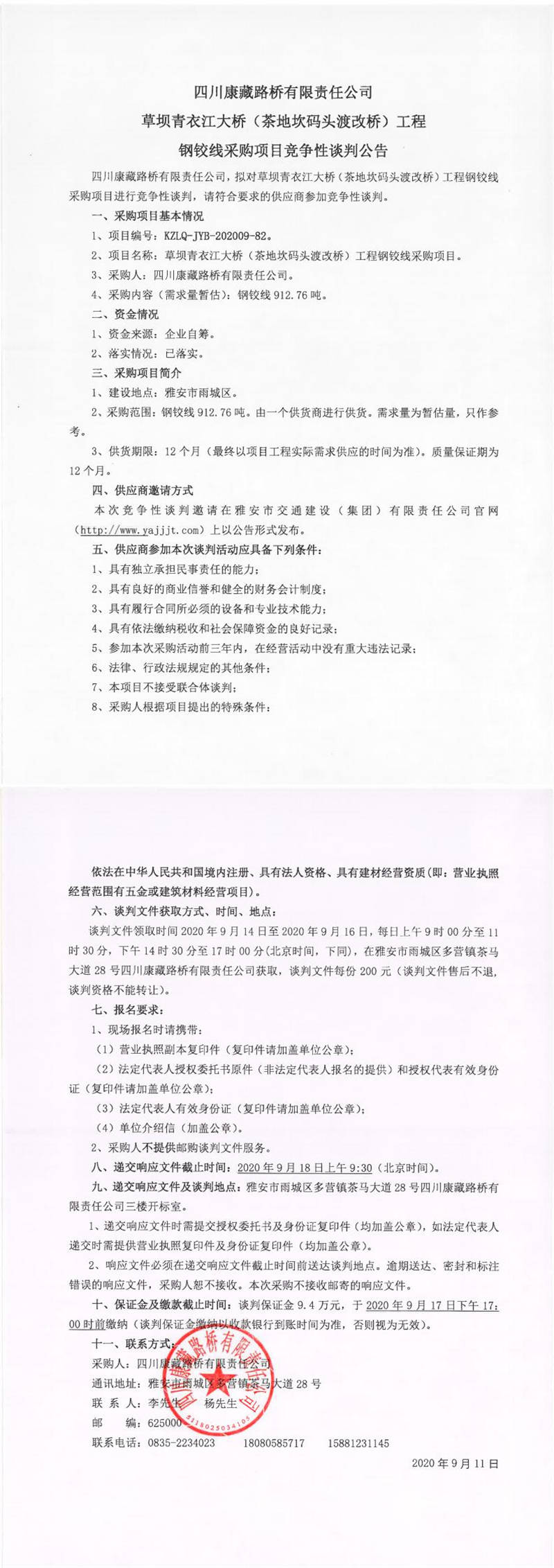 四川康藏路橋有限責(zé)任公司草壩青衣江大橋(茶地坎碼頭渡改橋)工程鋼鉸線采購項目競爭性談判公告