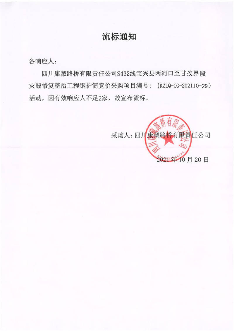 四川康藏路橋有限責(zé)任公司S432線寶興縣兩河口至甘孜界段災(zāi)毀修復(fù)整治工程鋼護筒競價采購流標通知
