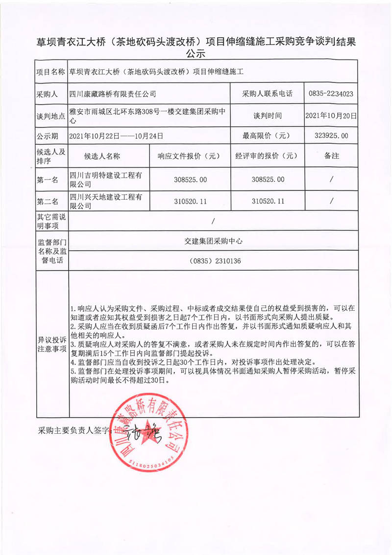 四川康藏路橋有限責任公司草壩青衣江大橋(茶地坎碼頭渡改橋)項目伸縮縫施工采購競爭談判結果公示