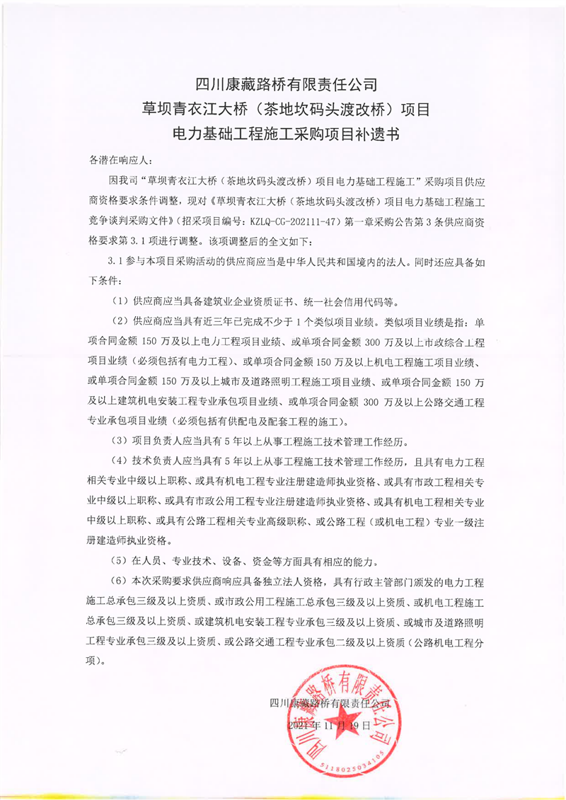 四川康藏路橋有限責(zé)任公司草壩青衣江大橋(茶地坎碼頭渡改橋)項目電力基礎(chǔ)工程施工采購項目補(bǔ)遺書