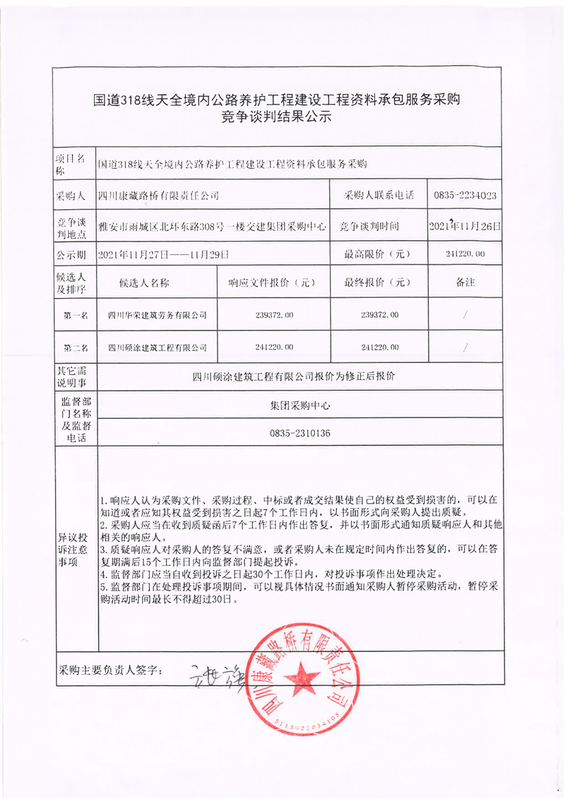 四川康藏路橋有限責(zé)任公司國道318線天全境內(nèi)公路養(yǎng)護(hù)工程建設(shè)工程資料承包服務(wù)采購競爭談判結(jié)果公示