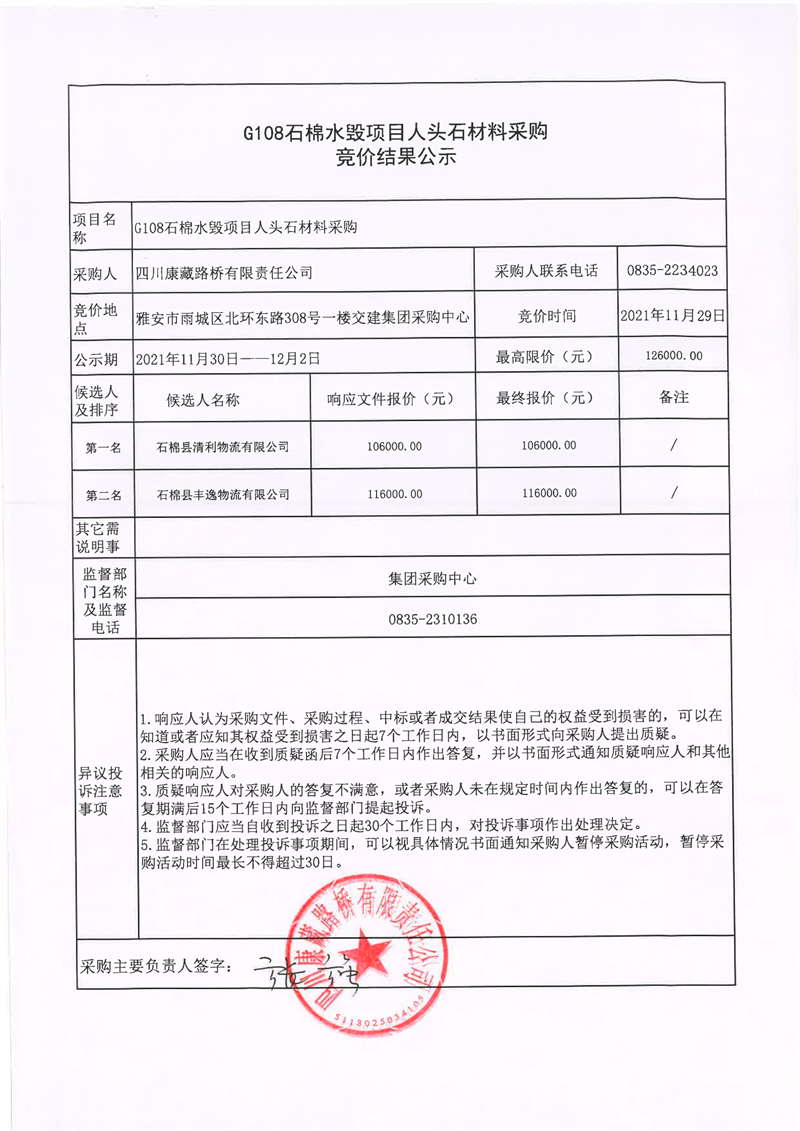 四川康藏路橋有限責(zé)任公司G108石棉水毀項目人頭石材料采購競價結(jié)果公示